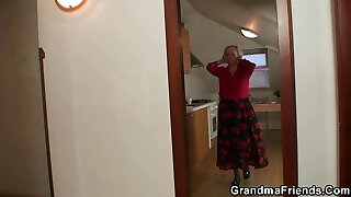 Insatiable, blonde granny is playing with her tits and her paramours dick, in the kitchen